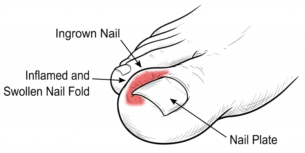 Ingrown nails occur when the corners or sides of the nail borders dig painfully into the soft tissue of the toe. This is a common nail impairment, and can lead soft tissue irritation, redness, and swelling.